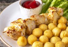 170/10 г • куриное филе, мука пшеничная, яйцо куриное, сыр сычужный, масло растительное, салат, зелень укропа