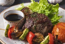 250/150/30/10 г • вырезка говяжья (прожарка "медиум"), салат свежий, зелень укропа, специи, баклажаны, перец сладкий свежий, шампиньоны свежие, помидоры свежие, лук репчатый, соус соевый, масло растительное, соус Деми-глясс
